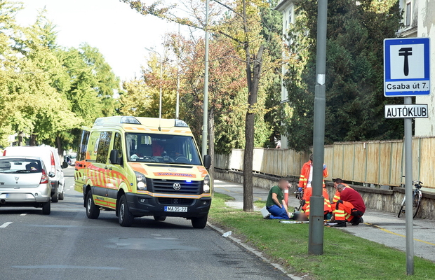 A Markusovszky kórház és a Vérellátó között egy idős kerékpáros esett el. A mentők kórházba szállították.