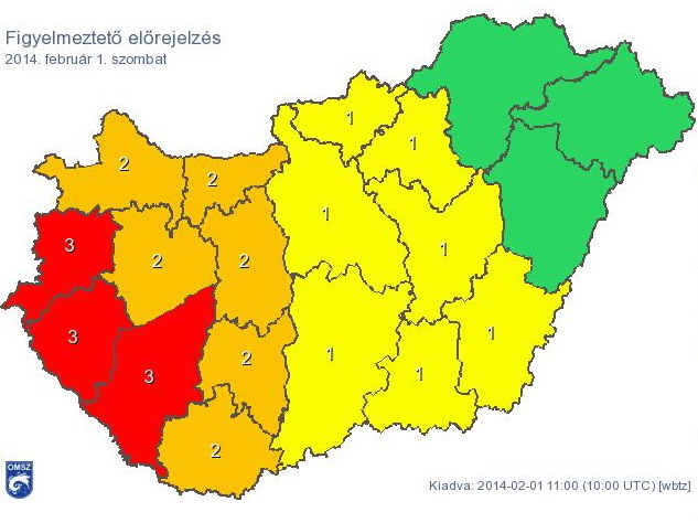 Vas megye területére harmadfokú, piros figyelmeztetést adott ki a meteorológiai szolgálat. Várhatóan a délutáni, kora esti óráktól délnyugat, dél felől előbb a Dunántúl nyugati felén, majd később a Dunántúlon másutt is kiterjedt tartós ónos eső, fagyott eső várható. Kiemelten a Dunántúl nyugati, délnyugati felén szombat délutántól a körülbelül vasárnap reggelig tartó periódusban jelentős mennyiségű ónos eső hullhat, amely jelentős mértékű jegesedést okozhat.