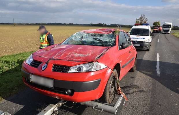 Felborult egy Renault személyautó a 87-es főúton, miután vezetője elszámított egy előzést és gyorsan akart visszatérni a sávjába a szemből érkező elől. Az előzött teherjármű eleje elérte a Renault hátulját, amitől az megpördült és árokba hajtott.
