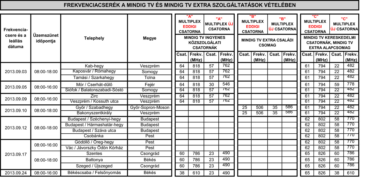 Az Antenna Hungária tervei szerint a digitális adók áthangolására a táblázatban megjelölt napokon kerül sor, a munkák miatt néhány órán keresztül szünetel a digitális sugárzás. A frekvenciacserék miatt a fenti időpontokban a munkavégzések idejére mindhárom multiplex sugárzása le lesz állítva, vagyis a MinDig TV és MinDig TV Extra csatornák nem érhetők el.