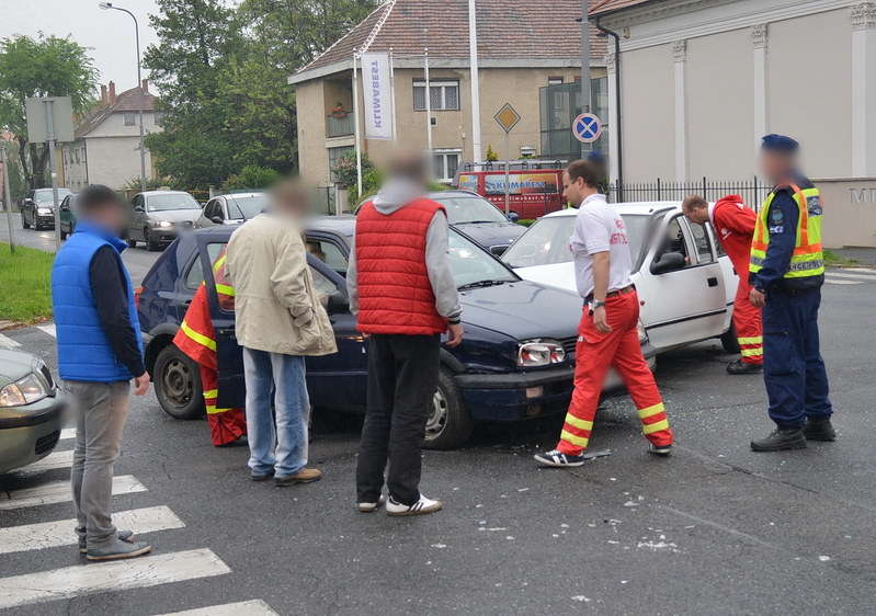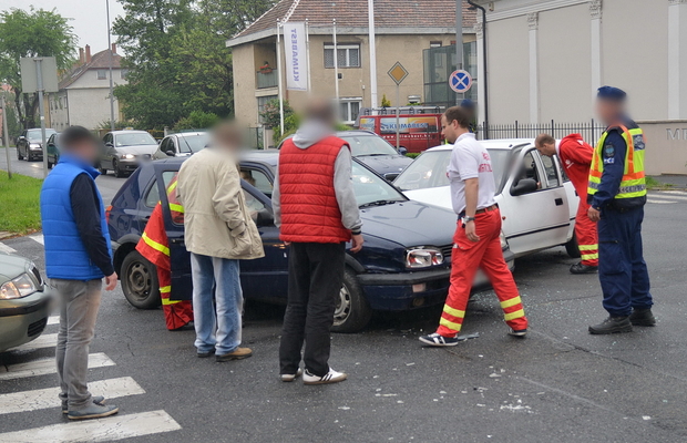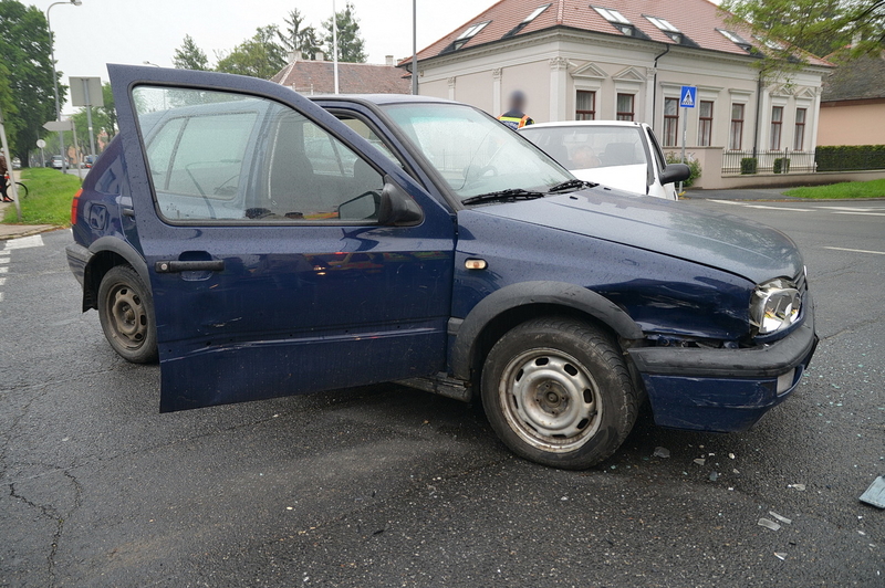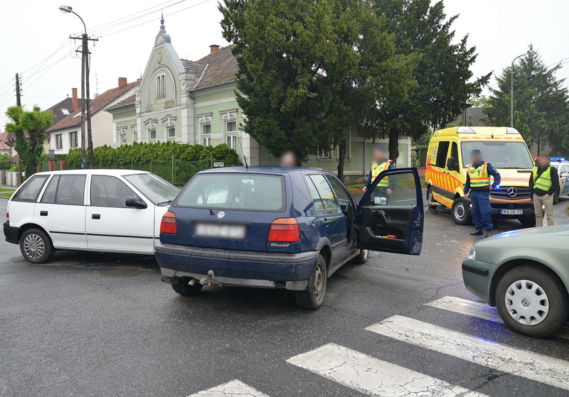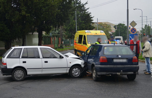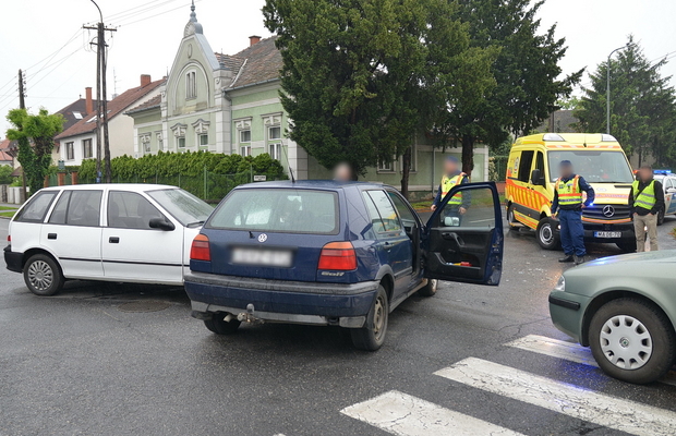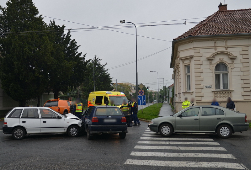 Egy Suzuki a Rákóczi Ferenc utcában a belváros felé tartott, a sofőrje azt hitte, hogy ő van a főútvonalon, ezért nem állt meg és nem adott elsőbbséget a neki jobbról érkező Volkswagennek és ütköztek. A harmadik autó, egy Skoda a város felől érkezett, nekiütközött a Volkswagen oldalának. A Volkswagen utasához mentőt hívtak.