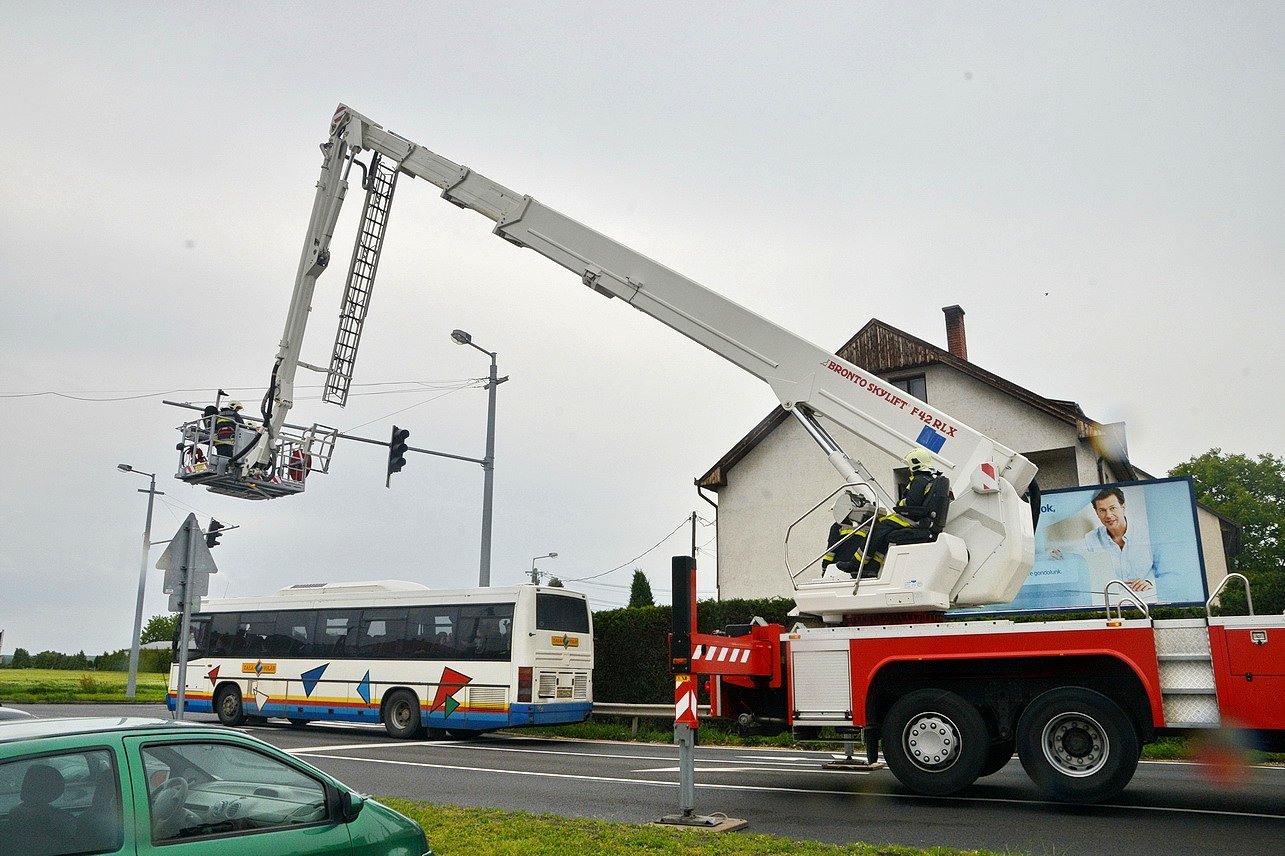 A 86-os főút Szombathelyen áthaladó szakaszán, a Rumi úti kereszteződésnél a lehető legrosszabb időben, a 16 órás csúcs idején szakadt le egy jelzőlámpa. A Magyar Közút szakembere a zuhogó esőben és a viharos szélben a tűzoltók emelőkosaras járművéből, tűzoltók segítségével szerelte fel az új jelzőlámpát a sérült helyett.