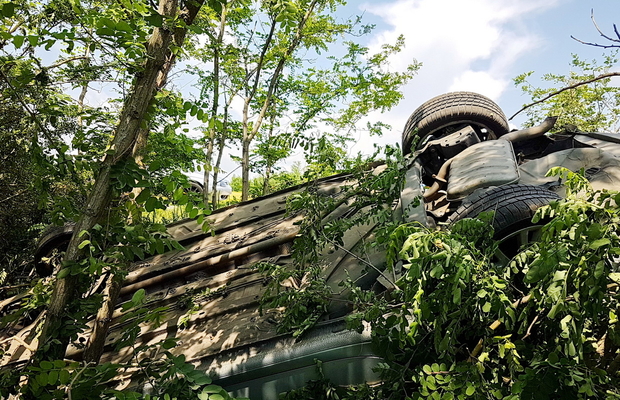 Az autót vezető férfi elmondása szerint defekt okozta a balesetet, ennek azonban szerintünk némileg ellentmond, hogy az úttesten nem láttunk erre utaló nyomot, de sokkal inkább az a tény, hogy a személyautóra felszerelt négy téli gumi egyike sincs kilyukadva. Véleményünk szerint a sofőr akár gondolhatta azt, hogy defektet kapott, amikor az autója irányt változtatott, de ez sokkal inkább a sebesség helytelen megválasztása lehetett a jobbra ívelő kanyarban, kiegészítve a közel harminc fokos melegben tapadását elvesztő téli gumival.