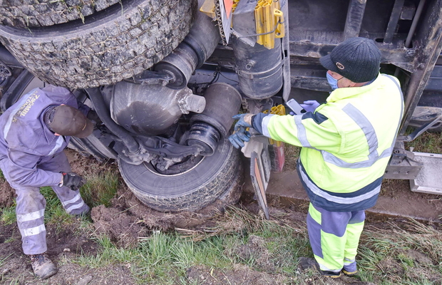 A pelletet szállító Scania kamion az árokban, az oldalára dőlve állt meg. Vezetője az elsődleges adatok alapján könnyű sérülést szenvedett, a mentők kórházba szállították.