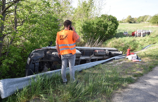 Gázpalackokat szállító kisteherautó borult patakmederbe Kemenesszentmártonnál. Videónk a műszaki mentést mutatja meg.