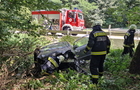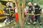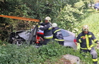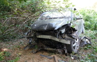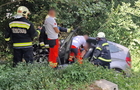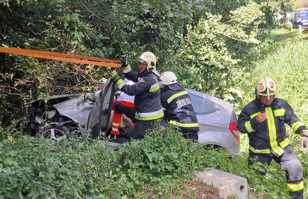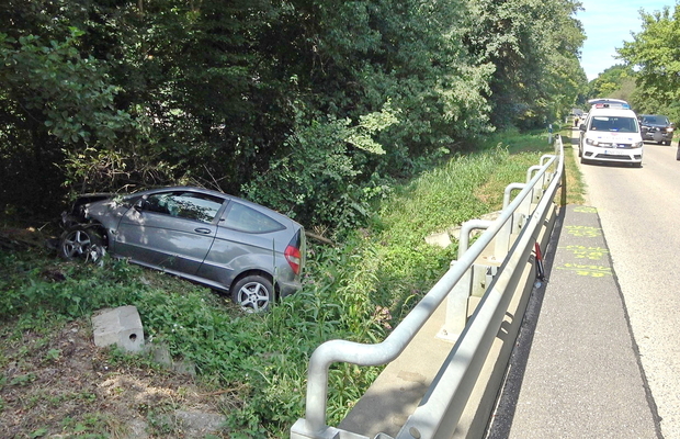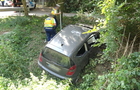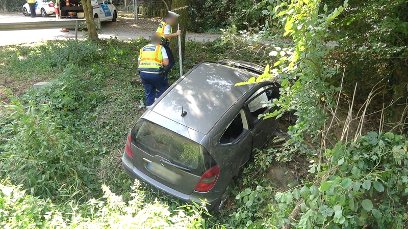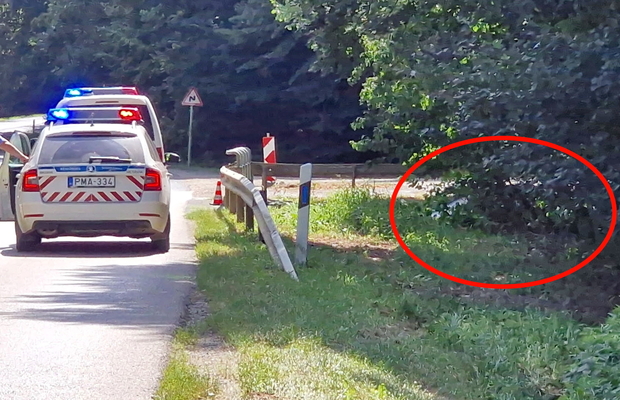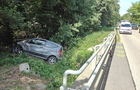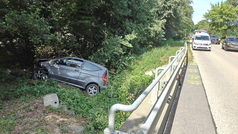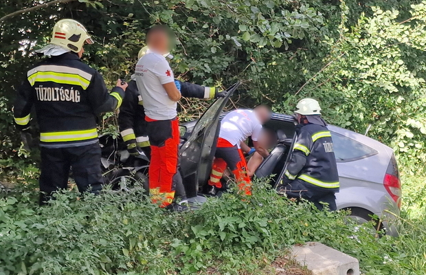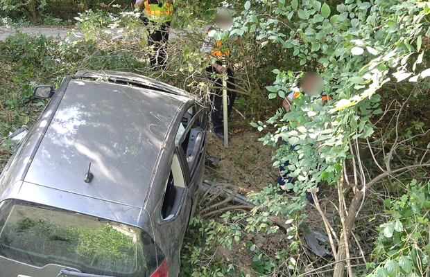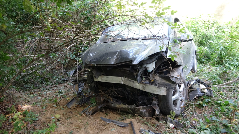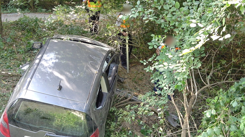 Az autó hosszan haladt füves területen, majd egy bekötőút töltésfalának ütközött egy fa törzse mellett és a vízelvezetőben állt meg.
